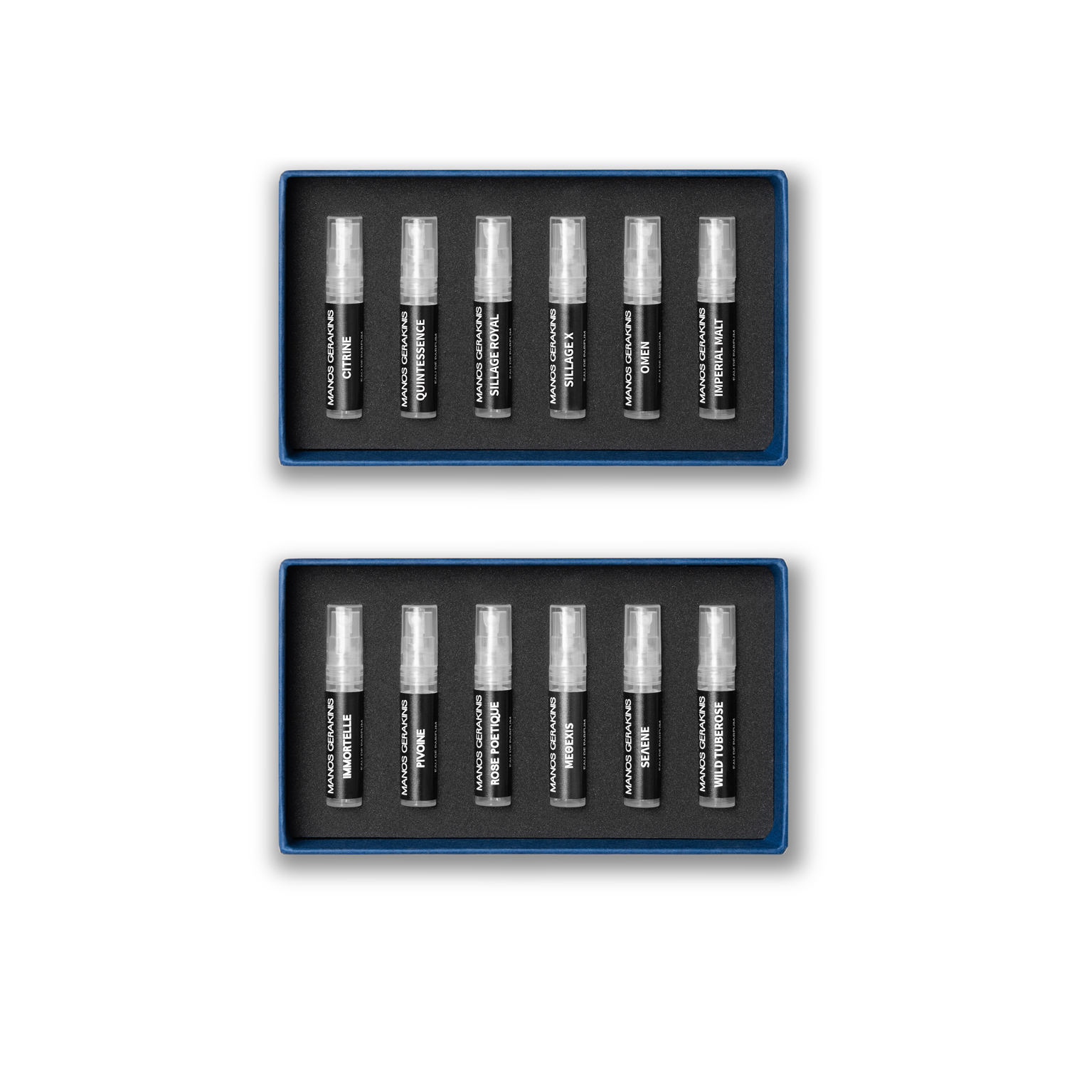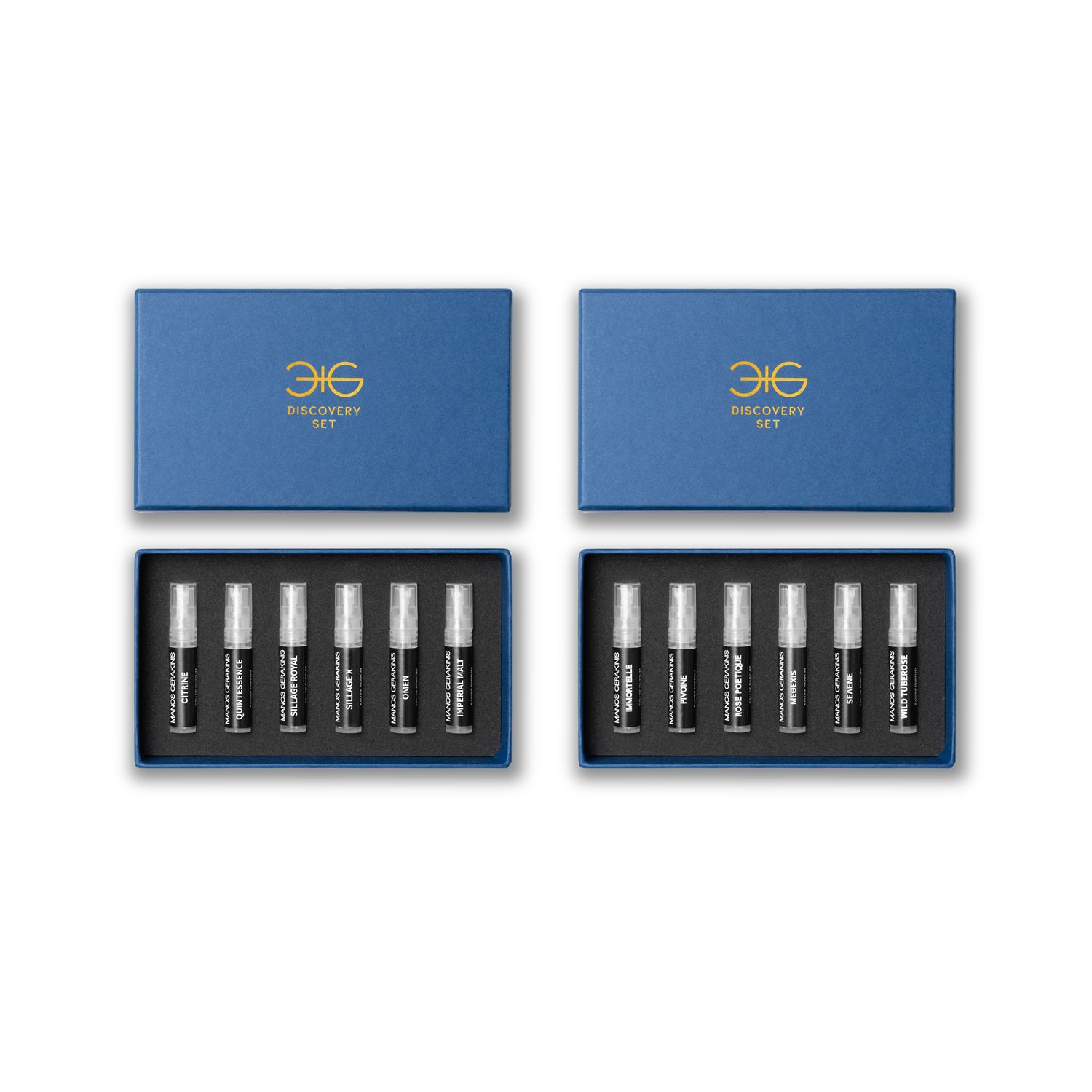 Our Discovery Bundle includes twelve generous (12×3ml) samples, split in two sets that come individually packaged in elegant blue boxes. Set I comprises 6×3ml samples of our floral and gourmand fragrances. Set II comprises 6×3ml samples of our most powerful and dynamic fragrances. Additionally, you will receive two shopping vouchers: a €20 one for the purchase of any 100ml fragrance included in Set I and a €25 one for the purchase of any 100ml fragrance included in Set II.
